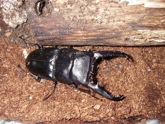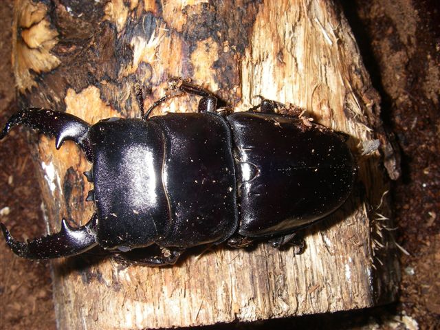 おつかれさまです。 写真は1ヶ月ぐらい前に羽化したパラワンオオヒラタクワガタです。 狭い飼育ビンから広い飼育ケースへ移しました、オオクワガタとの違いは大きなアゴの形が 違うところです、正確に測っていませんが80mmぐらいはあります、100mmオーバーでは ありませんがまずまずの形です。