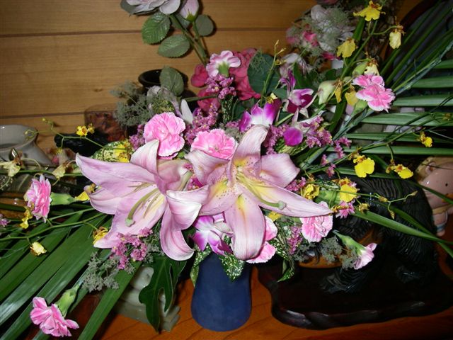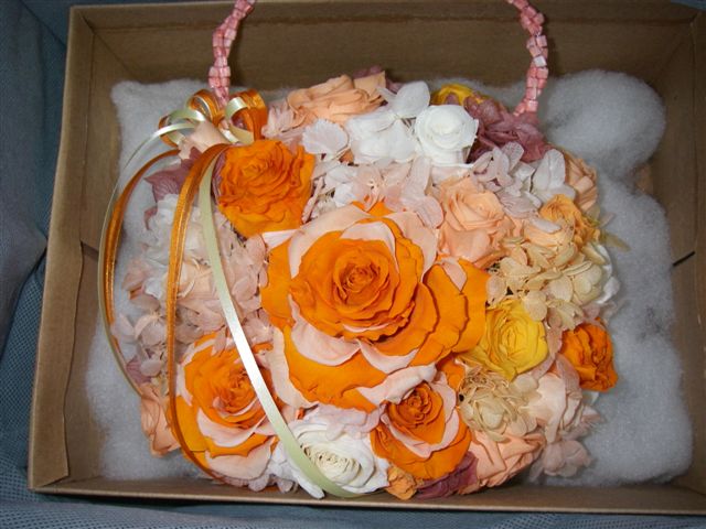 結婚式です、上の写真は妻が娘のために作ったキャンドルサービスのときに使うブーケバッグです。 フラワーアレンジメントの先生に教わりながら新郎用の胸に付ける飾りとペアで、二人が