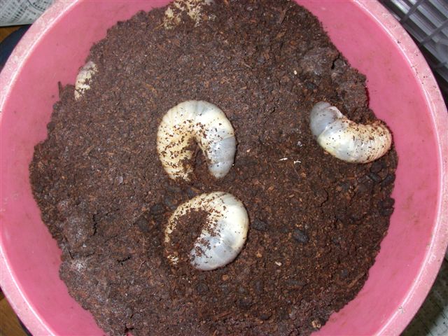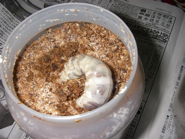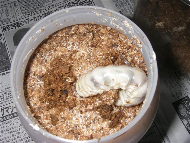 オオヒラタケの菌糸ビンで飼育している1頭と普通のマット飼育の1頭をしました。 写真は菌糸ビン飼育の幼虫です、3ヶ月前はマット飼育のより小さかったのですが今では逆転しています。